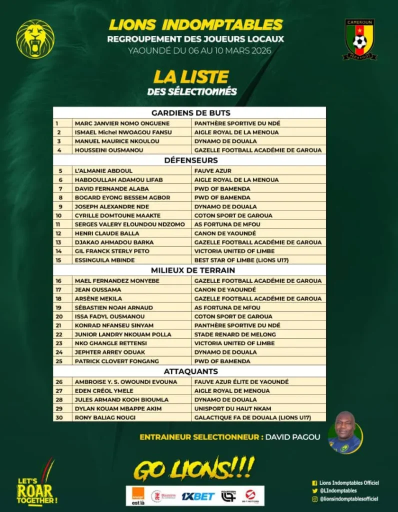 À quelques semaines des FIFA Series prévues en Australie, le nouveau sélectionneur des Lions Indomptables, David Pagou, a dévoilé une liste préliminaire de 30 joueurs issus du championnat local. Un choix stratégique dans le cadre d’un stage programmé du 6 au 10 mars.