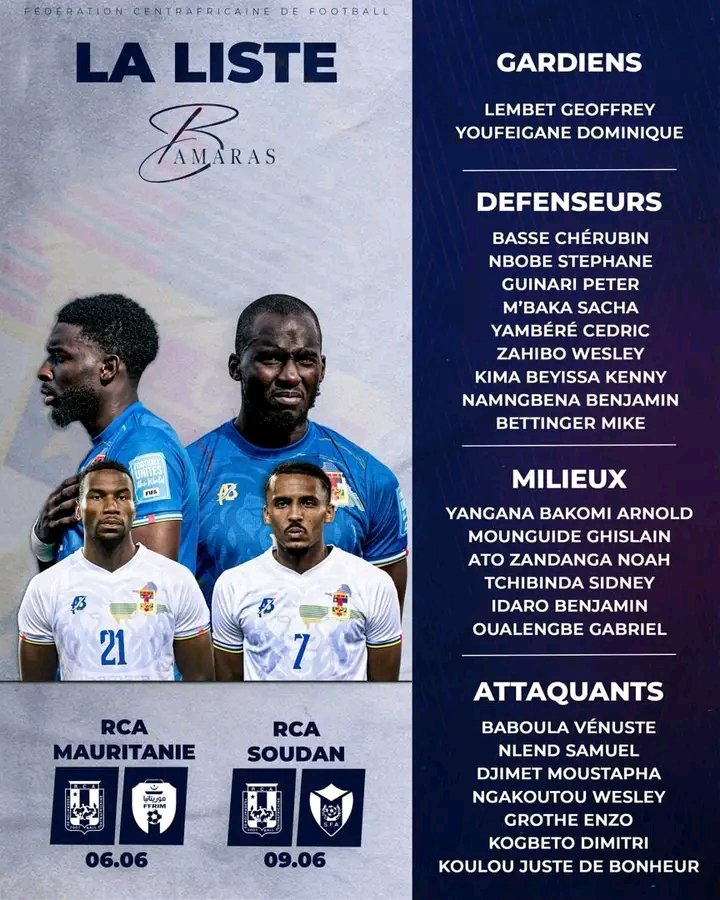 Le sélectionneur des Fauves de Bas-Oubangui, Éloge ENZA, vient de dévoiler la liste des 24 Fauves retenus pour les deux matchs amicaux : le 6 juin face à la Mauritanie et le 9 juin contre le Soudan. On note les absences de G. Kondogbia, Louis Mafouta, G. Koyalipou, Donald Benamna sur cette liste.