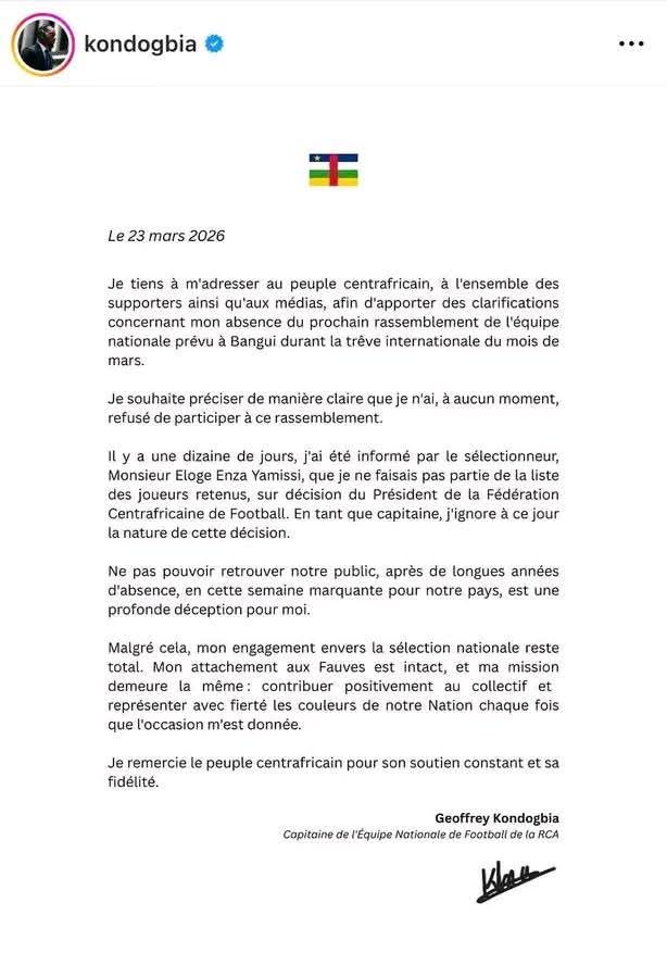 On note également le retour de plusieurs cadres comme Godwin Kayalipou et Severin Tatolna, alors que le capitaine Geoffrey Kondogbia, Cédric Yambéré et Amos Youga sont absents. Le joueur le plus emplématique de la République centrafricain a réagi à sa non-sélection via un communiqué.