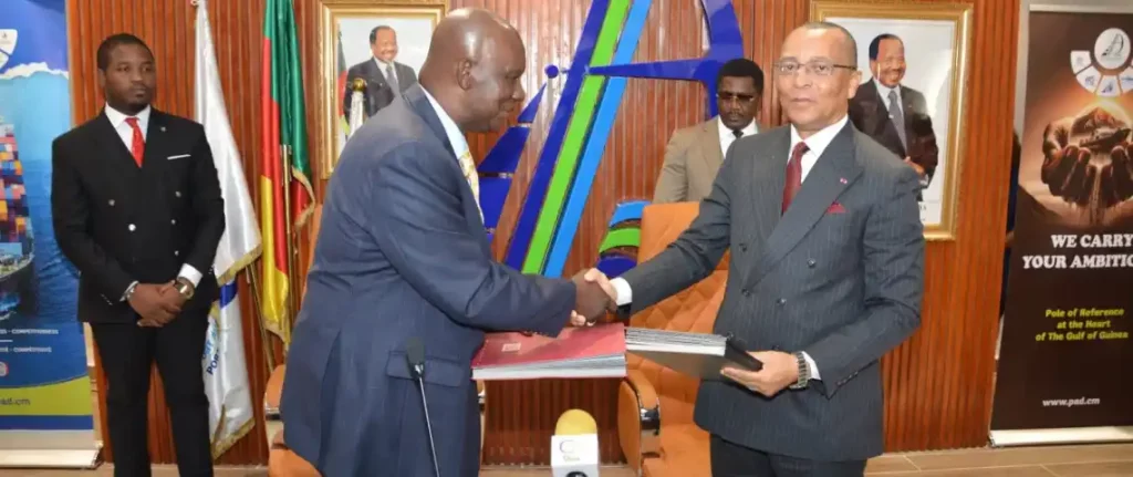 Le Directeur Général du Port autonome de Douala (PAD), M. Cyrus Ngo’o, et le Directeur Général du Conseil Centrafricain des Chargeurs (CCAC), M. Bertin Médard Ngounio ont signé, le 8 juillet 2025 dans la salle de réunions du siège de l’entreprise publique gestionnaire du Port de Douala-Bonabéri, un protocole d’accord.